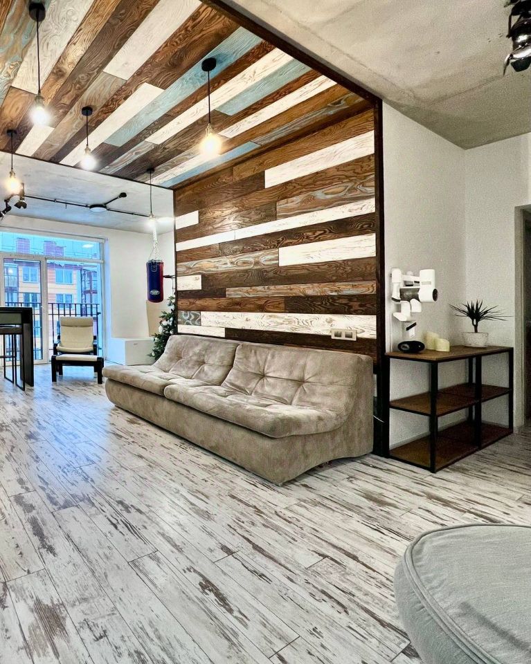 Уникальный дизайн квартиры в стиле комфортного лофта - высокие потолки, большие окна, открытые коммуникации, акцентный свет, бетон, дерево, натуральный камень и кирпич в сочетании в современными материалами создают неповторимую атмосферу уюта.