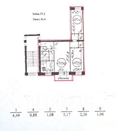 Общая 56 кв м + застекл. балкон, жилая 41: 21+10+11, кухня 5,2, разд. санузел с ванной, две кладовки.