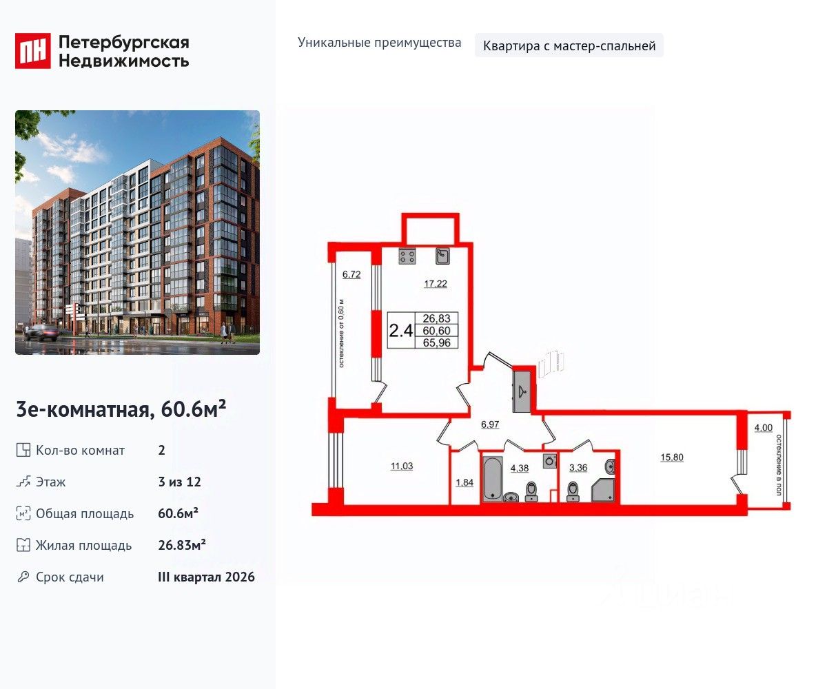 Уникальная, функциональная европланировка, большая кухня-гостиная 17.22 м², вместительная прихожая 6.97 м². Общая площадь квартиры - 60.6 м², жилая 26.83 м², высота потолка 2.77 м.