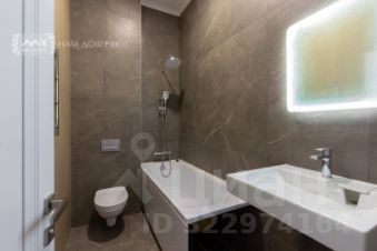 Совмещенный санузел с современной сантехникой: акриловая ванна, смеситель с тропическим душем, зеркало со встроенным светильником, электрический полотенцесушитель, электрический обогрев пола с регулятором температуры