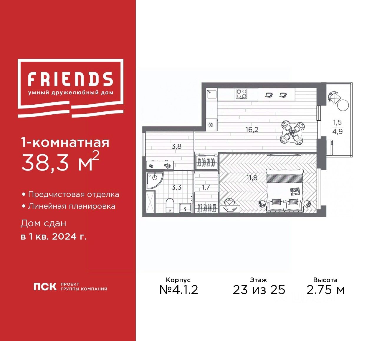 Однокомнатная квартира с предчистовой отделкой в ЖК "Friends" на 23 этаже. Общая площадь: 38.3 кв.м., жилая: 11.8 кв.м., площадь просторной кухни-столовой: 16.2 кв.м. Все окна выходят на одну сторону. В квартире один балкон, один совмещенный санузел. Высота потолков 2.75 м.