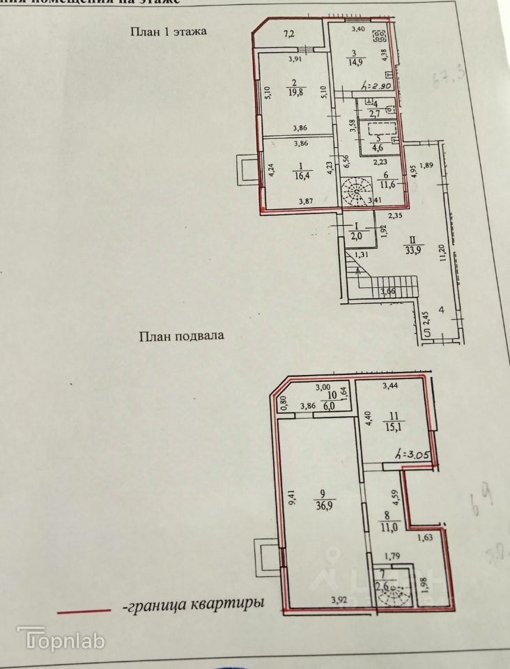 В нижнем части квартиры:Н-3,05, к-та 36,9 кв.м,+6кв.м.