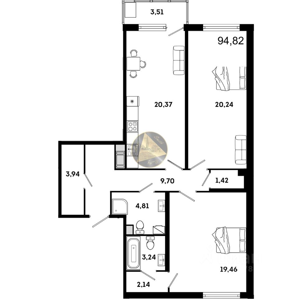 - Общая площадь квартиры 94.82 м2