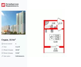 Удобная, классическая, функциональная европланировка, вместительная прихожая 2.1 м². Общая площадь студии - 18.4 м², жилая 12.6 м², высота потолка 2.56 м.