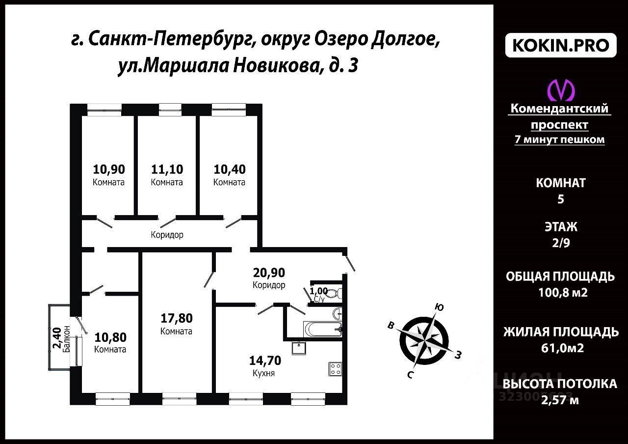 Kвартиpa для большой семьи: 5 комнат и удобнoе pаcполoжение у метpo "Koмeндaнтcкий пр."
