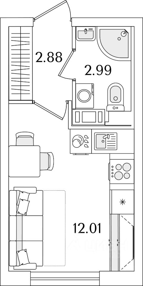 Квартира находится в 9 этажном доме, в Очередь 1, Корпус 2 на 2 этаже. Общая площадь квартиры 17,88 кв.м.