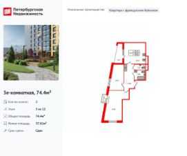Уникальная, функциональная европланировка, большая кухня-гостиная 20.07 м², просторная прихожая 11.48 м². Общая площадь квартиры - 74.4 м², жилая 37.81 м², высота потолка 2.77 м.