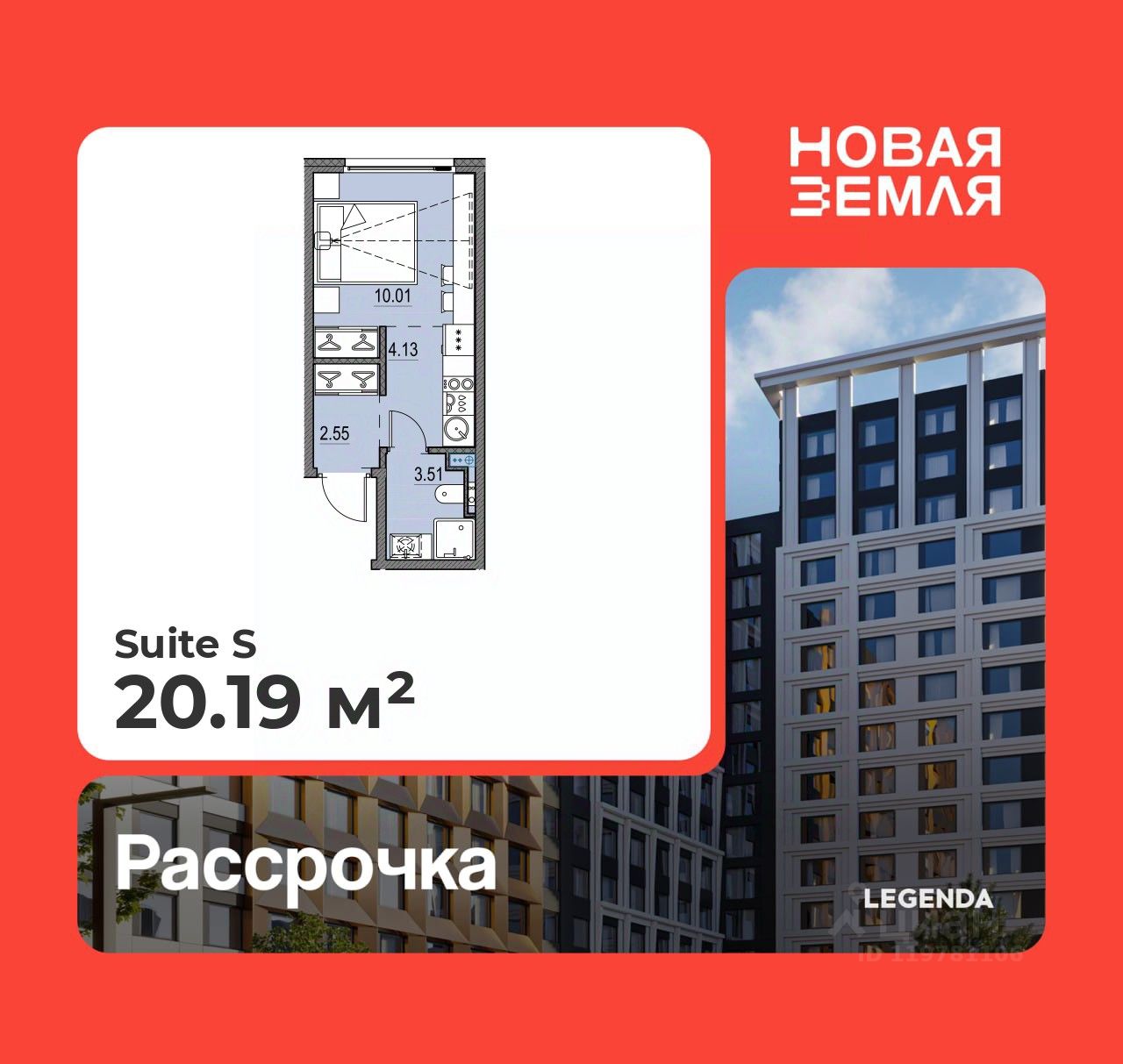 1-комн. квартира-студия с предчистовой отделкой в ЖК "Новая Земля" на 16 этаже. Общая площадь: 20.19 кв.м., площадь гостиной 14.14 кв.м., из которых 4.13 кв.м. выделено под кухонную зону. Все окна выходят на одну сторону. В квартире один совмещенный санузел. Высота потолков 2.85 м.