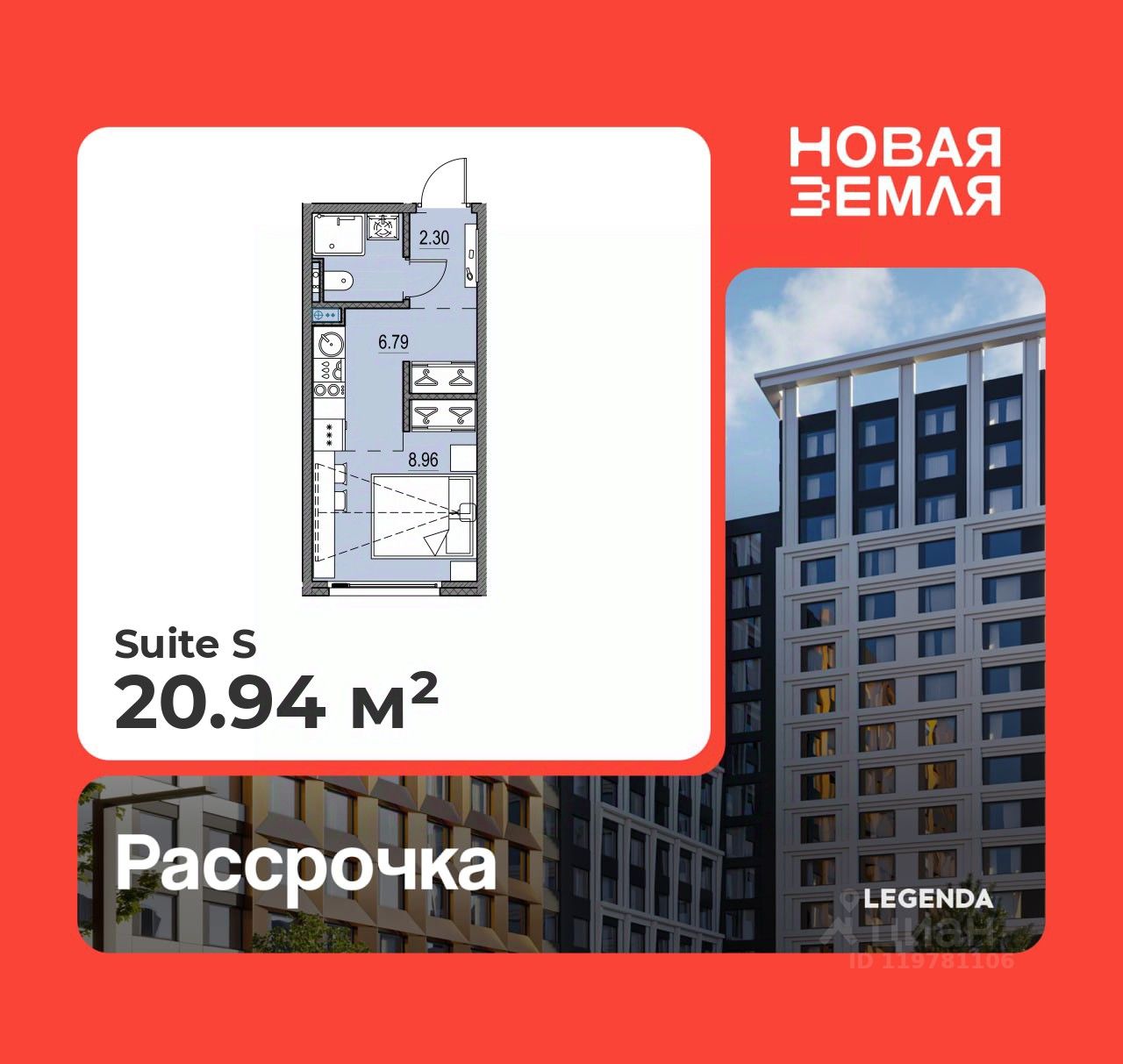 Просторная 1-комн. квартира-студия с предчистовой отделкой в ЖК "Новая Земля" на 8 этаже. Общая площадь: 20.94 кв.м., площадь гостиной 15.75 кв.м., из которых 6.79 кв.м. выделено под кухонную зону. Все окна выходят на одну сторону. В квартире один совмещенный санузел. Высота потолков 2.85 м.