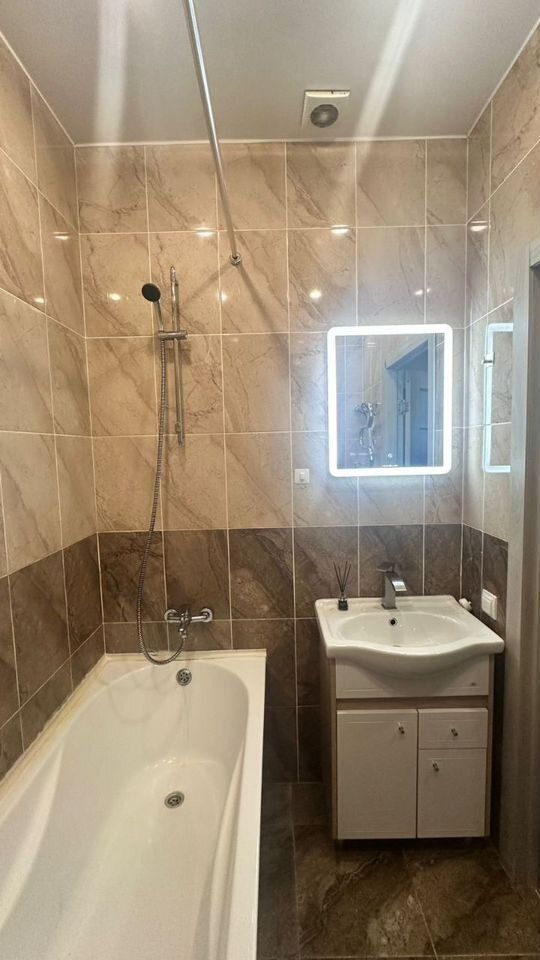 Выполнена качественная отделка, делали ремонт для себя - ламинат на полу, качественные двери и обои, плитка и сантехника в санузле.