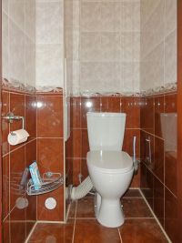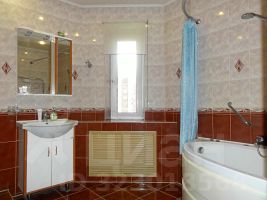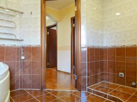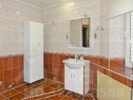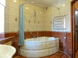 • Просторная ванная комната с окном, где удобно и легко расположились: радиатор отопления, шкафы, умывальник, стиральная машина и ванна джакузи;
