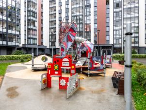 На закрытой охраняемой территории ЖК есть приятные места отдыха: большие качели, столы для игры в шахматы, а также детская и спортивная площадки. В доме есть подземный паркинг.