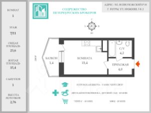 Общая площадь квартиры составляет 25 кв. м. включая просторную лоджию с прекрасным видом, жилая площадь — 15.4 кв. м. Высота потолков 2.76 метра. Окна выходят во двор, обеспечивая тишину и уют.