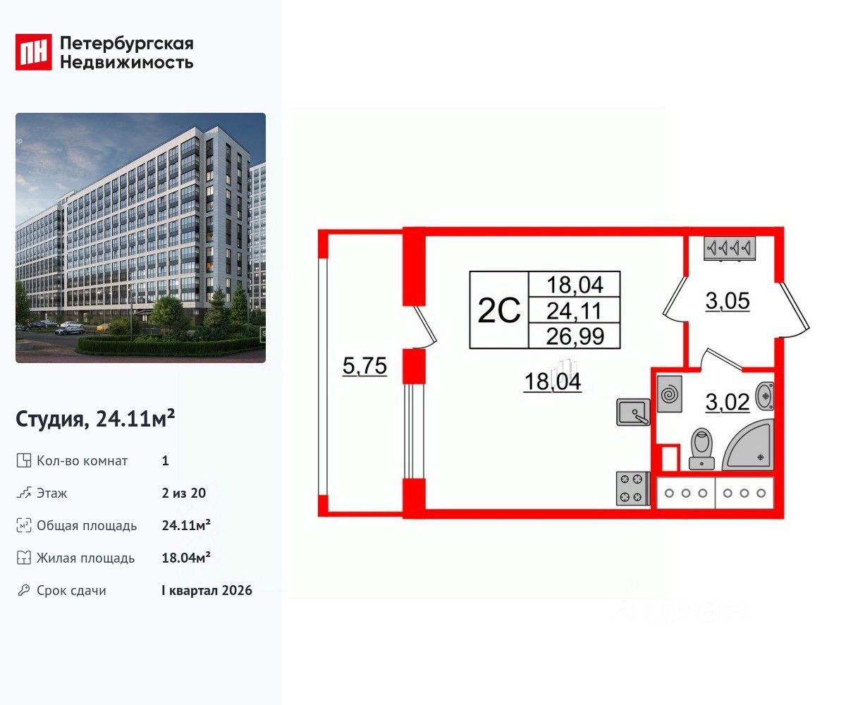 Удобная, классическая, функциональная европланировка, вместительная прихожая 3.05 м². Общая площадь студии - 24.11 м², жилая 18.04 м², высота потолка 2.77 м.