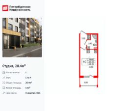 Удобная, классическая, функциональная европланировка, вместительная прихожая 3 м². Общая площадь студии - 20.4 м², жилая 14 м², высота потолка 2.78 м.