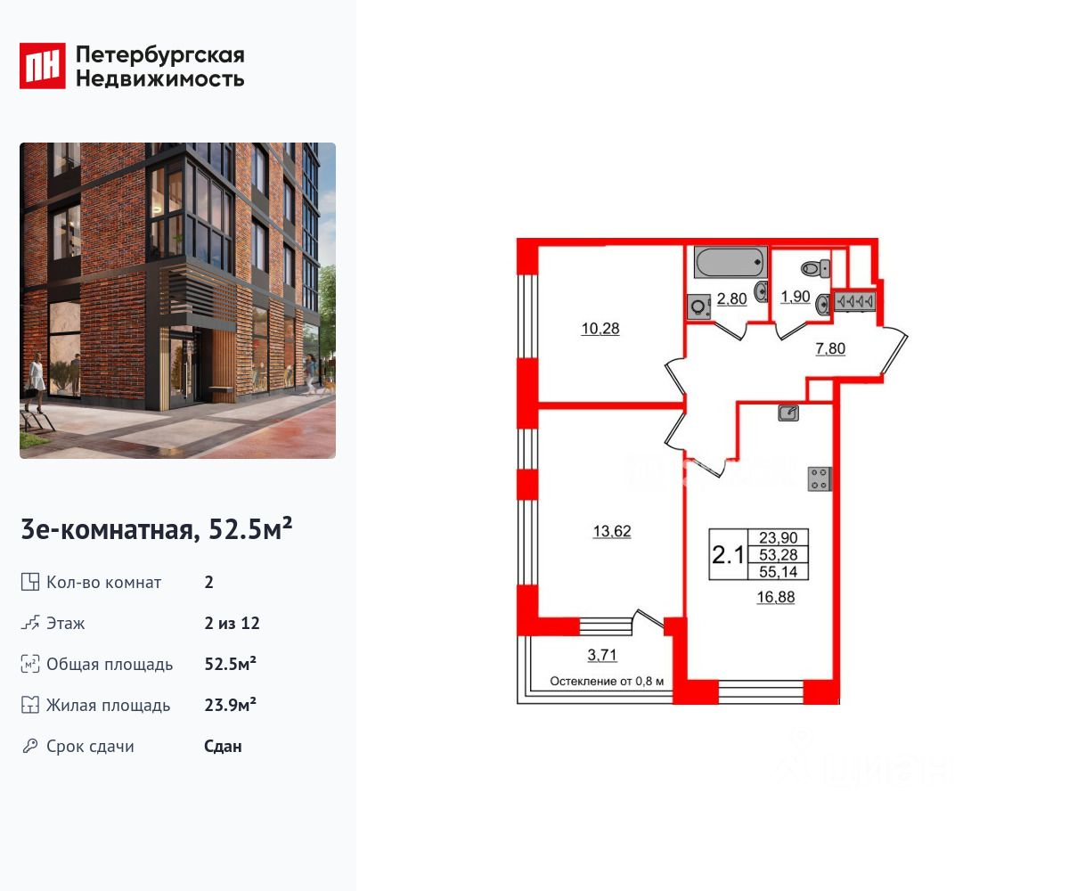 Удобная, классическая, функциональная европланировка, большая кухня-гостиная 16.76 м², вместительная прихожая 7.21 м². Общая площадь квартиры - 52.5 м², жилая 23.9 м², высота потолка 2.77 м.