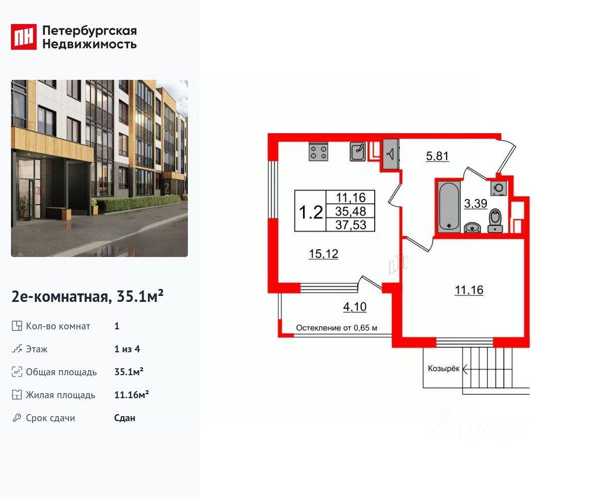 Удобная, классическая, функциональная европланировка, большая кухня-гостиная 15.12 м², просторная прихожая 5.81 м². Общая площадь квартиры - 35.1 м², жилая 11.16 м², высота потолка 2.77 м.