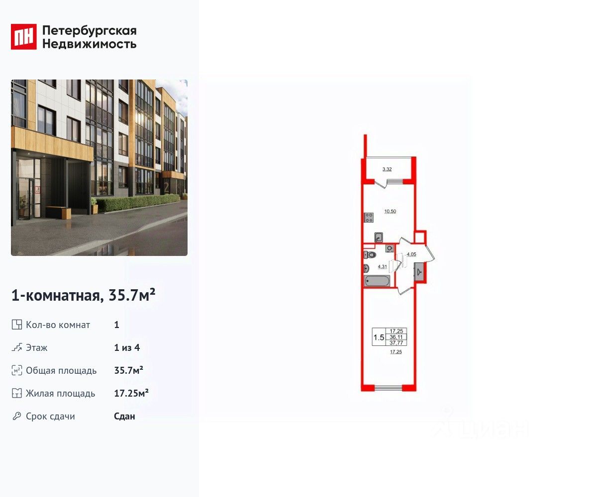 Удобная, классическая планировка, кухня 10.5 м², вместительная прихожая 4.05 м². Общая площадь квартиры - 35.7 м², жилая 17.25 м², высота потолка 2.77 м.