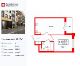 Удобная, классическая, функциональная европланировка, большая кухня-гостиная 15.44 м², вместительная прихожая 3.74 м². Общая площадь квартиры - 33.27 м², жилая 10.24 м², высота потолка 2.77 м.
