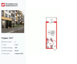 Удобная, классическая, функциональная европланировка, вместительная прихожая 3 м². Общая площадь студии - 25 м², жилая 18.1 м², высота потолка 2.78 м.