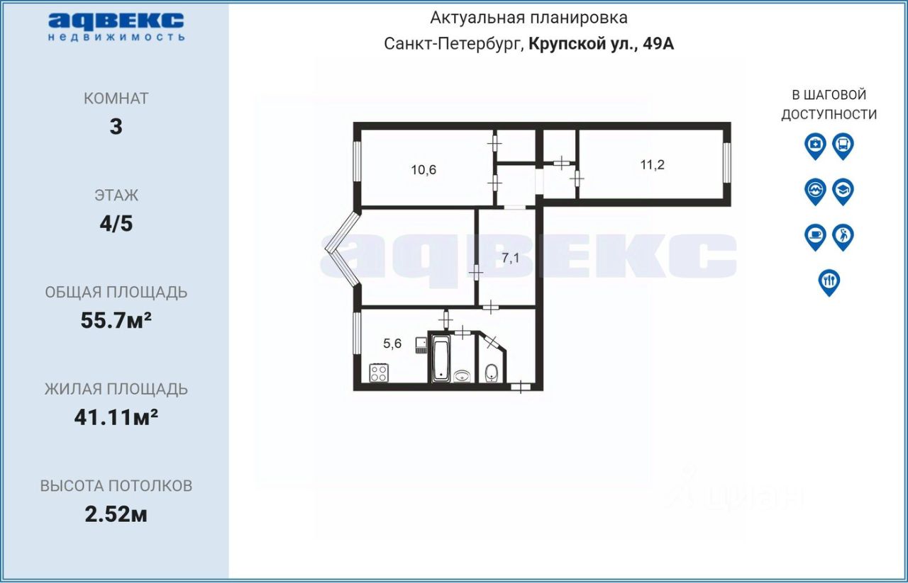 - Общая площадь: 55,7м