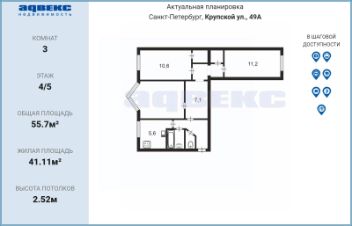 В продаже трехкомнатная квартира 55,7м на 4 этаже в Невском районе Санкт-Петербурга с эркером.