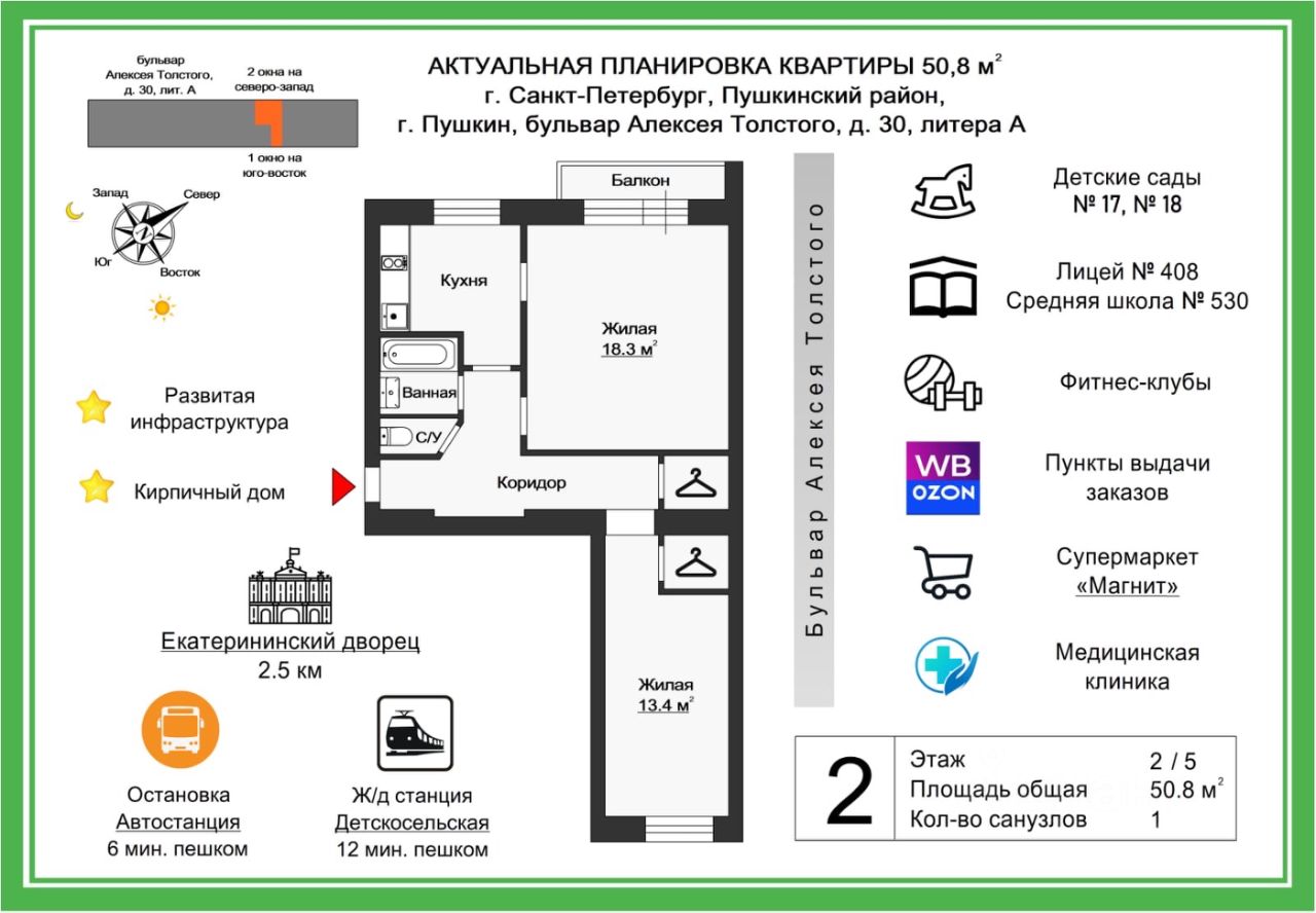 7 минут пешком до ж/д станции Царское Село (30 мин на комфортной электричке до центра города - Витебский вокзал).