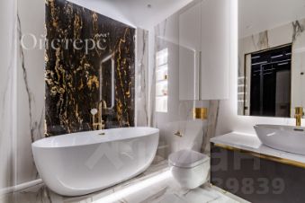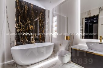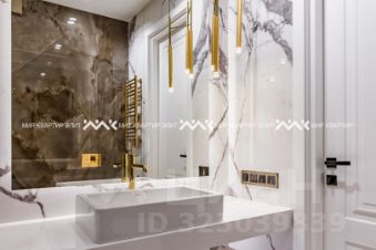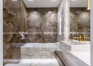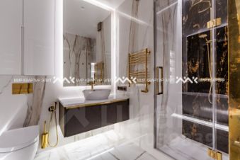 В отделке использованы материалы премиального уровня: сантехника Villeroy & Boch, крупноформатный керамогранит итальянской фабрики REX, паркет "французская ёлка" и дизайнерские элементы, выполненные по индивидуальным проектам.