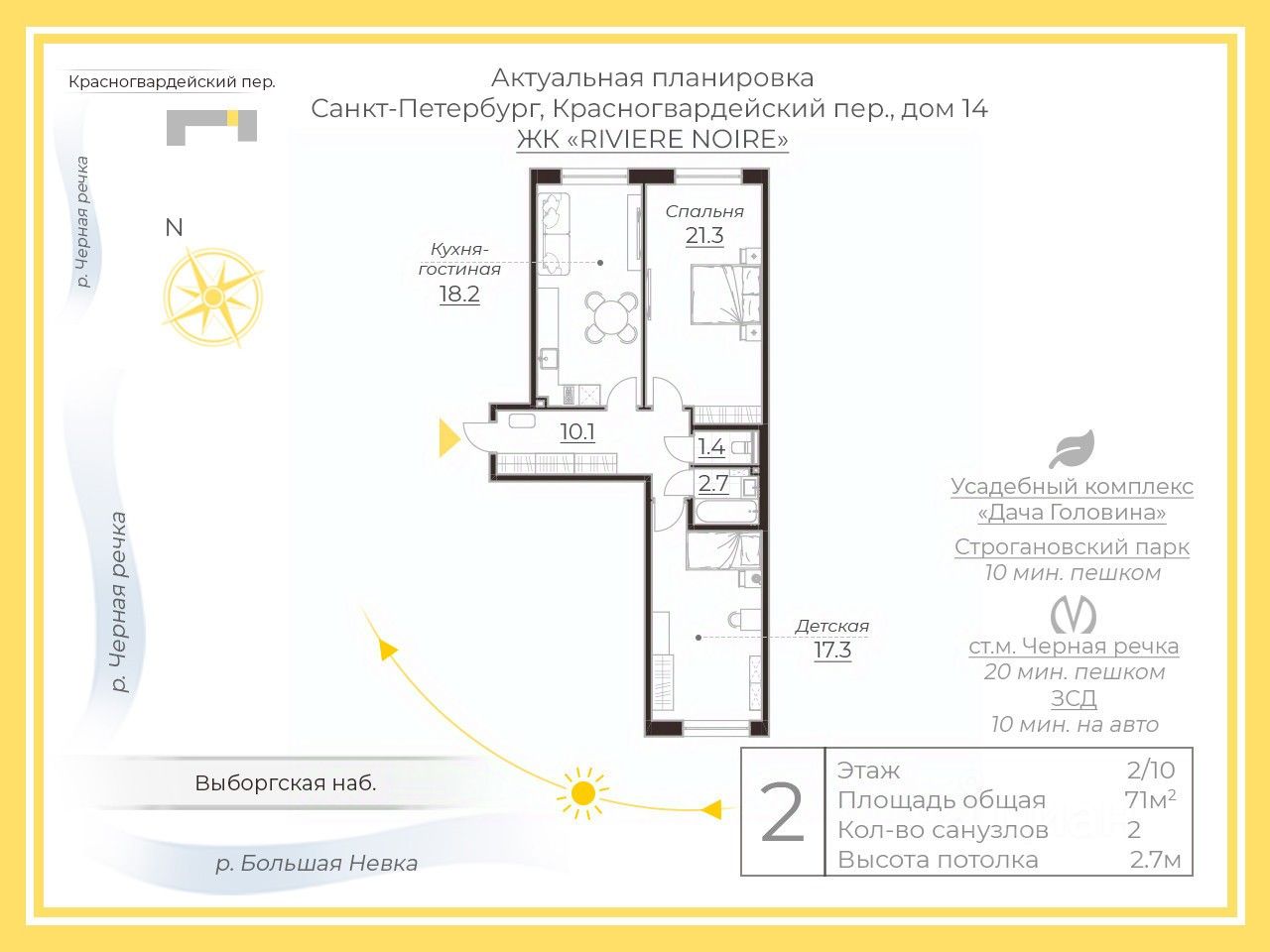 RIVIERE NOIRE - эксклюзивный комплекс на набережной Черной речки, рядом с Петроградской стороной. Проект имеет привилегированное расположение, с легким доступом через Кантемировский мост на Петроградскую сторону и недалеко от Каменного и Елагина островов, а также курортов Финского залива. Две станции метро - "Черная речка" и "Лесная" - находятся в шаговой доступности.