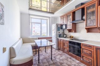 Большая кухня с зеркальным потолком позволяет комфортно принимать много гостей.