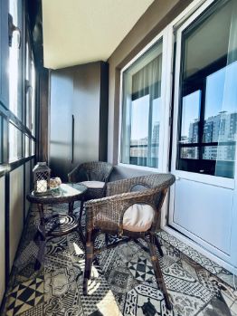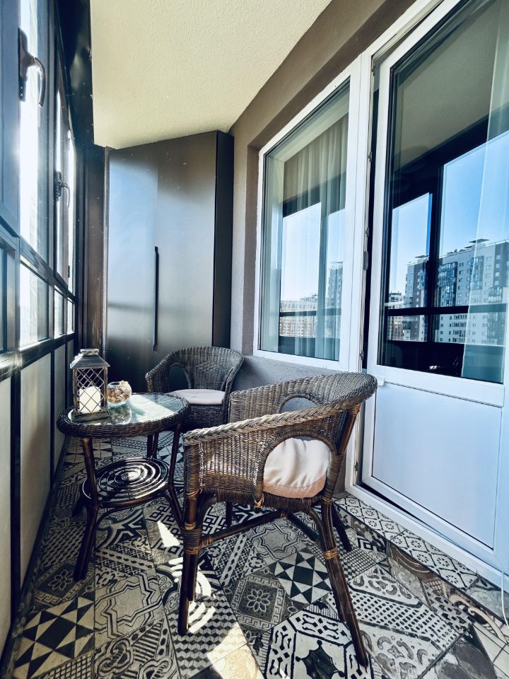 Из кухни выход на лоджию. Лоджия с встроенным шкафом для хранения вещей и напольной плиткой — идеальное место для уютного отдыха или хранения.