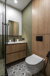 В санузле установлена душевая кабина с системой тропического душа, также предусмотрен шкаф для хранения моющих средств. Санузел оснащен теплым полом.