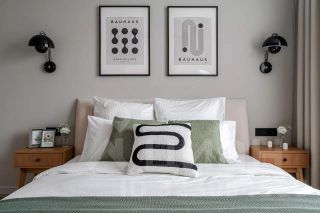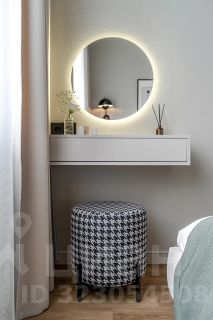 В спальной комнате установлена двухспальная кровать с прикроватными тумбами, подвесной косметический стол с зеркалом.