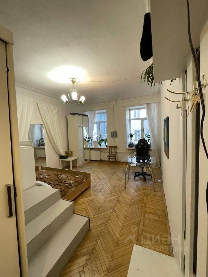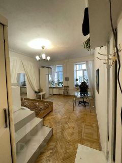 Комната, переделанная в студию. Своя кухня, туалет и душевая кабинка. Комната тридцать метров площадью, за ней отдельный санузел + 4,2 квадратных метра. Стиральная машина стоит на общей кухне, есть возможность переместить в комнату. Высокие потолки. Два больших окна. Выдвижная двуспальная кровать и встроенные длинные ящики в подиуме. Установлен отдельный счётчик электроэнергии.