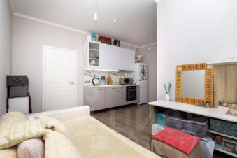 В квартире выполнен косметический ремонт, что позволяет сразу заехать и жить. Планировка студии грамотно продумана: есть совмещенный санузел, зонирование зоны кухни и спальни и лоджия, окна выходят во двор с видом на лес, что обеспечивает тишину и уют.