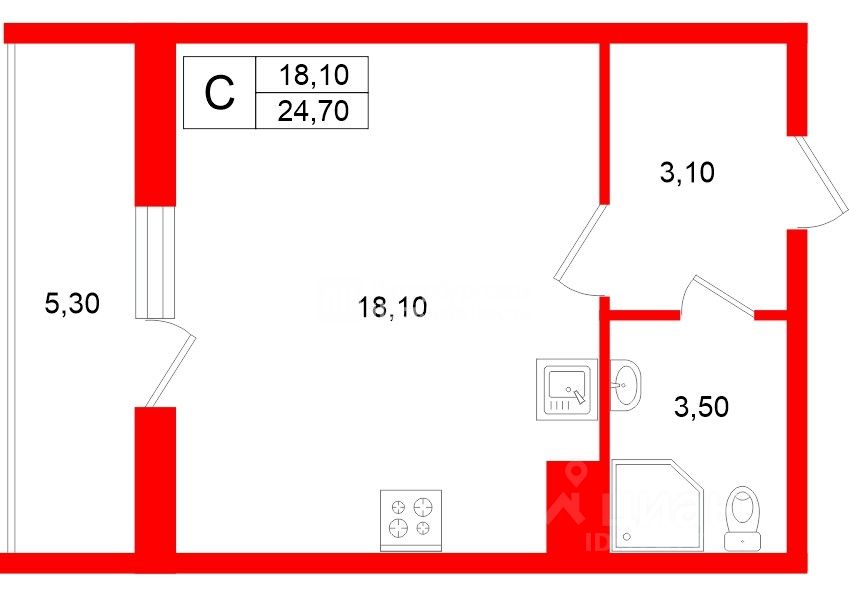 Квартира имеет очень удобную для студии планировку, широкая (почти четыре с половиной метра) комната, прихожая с местом под гардероб.