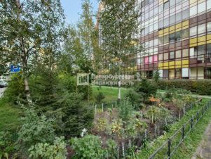 Перед окнами зелёная зона с цветами, деревьями, кустарниками.