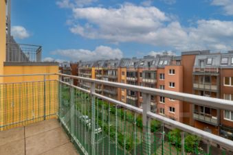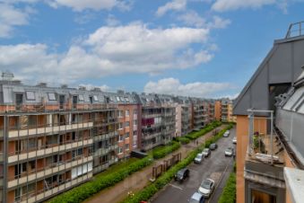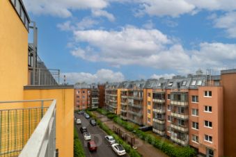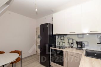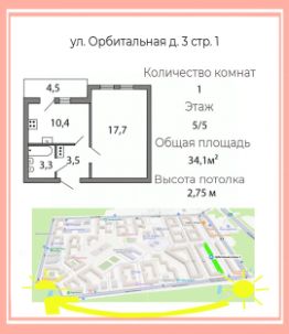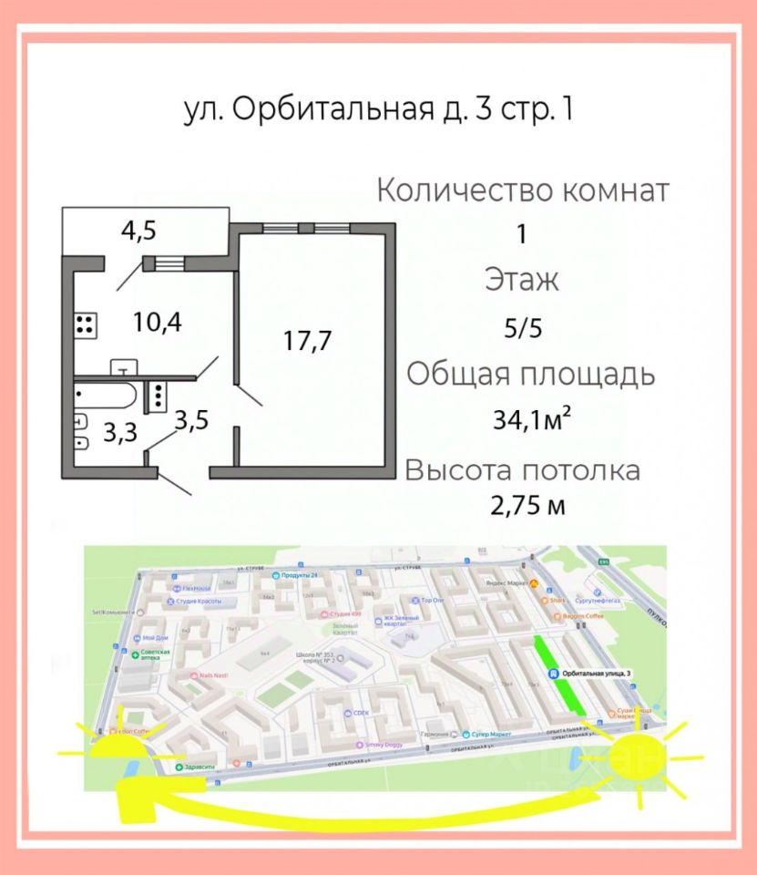 Общая площадь квартиры — 34 кв. м, включая просторную кухню площадью 10,4 кв. м., комнату 17,7кв. М. и терассу 4,5 кв. м. Квартира расположена на 5 этаже 5-этажного дома с грузовым лифтом. Высота потолков — 2,75 метра, что создает ощущение простора.