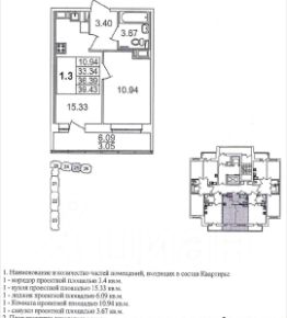 Квартира площадью 33м2 плюс большой утеплённый балкон 6м2.