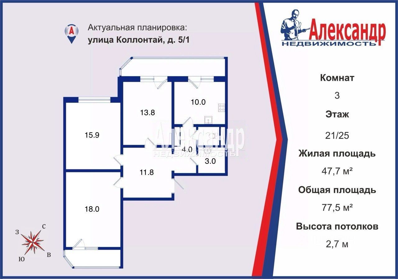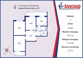 1704798 Просторная, светлая 3-комнатная квартира с панорамным видом на город! Квартира расположена на 21 этаже, выходит на две стороны дома. Хорошая вентиляция и освещенность. Из окон открывается вид на город, в праздники можно наблюдать салют прямо из дома, а в остальные дни провожать закаты и встречать рассветы! В квартире две лоджии, во двор и на улицу Коллонтай, вторая лоджия объединяет кухню и комнату и имеет выход с двух помещений, что позволяет использовать ее как место для отдыха и хранения всех необходимых вещей. Кухонный гарнитур с техникой и встроенный шкаф-купе в коридоре остается новому владельцу. Теплые полы в коридоре и на кухне. Дом располагается в одном из лучших мест по инфраструктуре, рядом есть все необходимое - школы и детсады, магазины, аптеки, рестораны, ТРК, спортивные комплексы, поликлиники. Удобная транспортная доступность как на личном, так и на общественном транспорте, до метро 10 минут пешком. Огороженный двор, современные детские площадки, три лифта в парадной. Действующий ухоженный мусоропровод. Первый этаж занимают коммерческие помещения. Хорошая Управляющая компания, которая располагается в самом доме. В доме нет студий, мало квартир на этаже, соседи спокойные, семейные люди. Квартира в собственности с момента постройки, использовался маткапитал, доли выделены, ипотека погашена, встречная покупка. Звоните\пишите, отвечу на все вопросы и назначим просмотр квартиры!