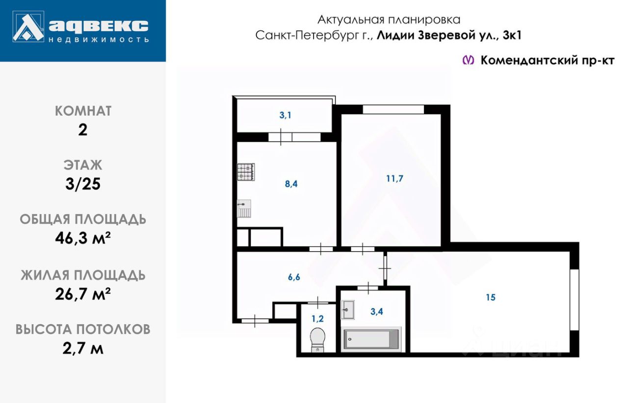 Продается 2-комнатная квартира общей площадью 46,3 кв. м в Приморском районе по адресу: ул. Лидии Зверевой, д.3