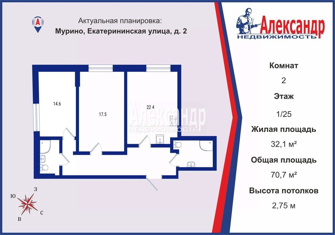 Два санузла, расположенных на разных концах квартиры.