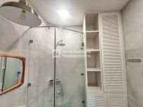 Удобная ванная комната с классическим дизайном и закрытой техникой выглядит очень эстетично. Душевая комната практично оборудована и приятно оформлена в мягких тонах.