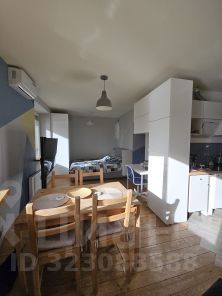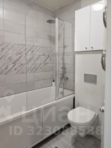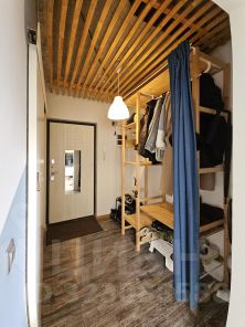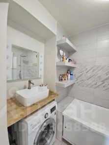 - Санузел совмещенный, стиральная машина с функцией сушки удачно размещена под раковиной. Раздвижная дверь в ванную экономит пространство и удобна в быту.