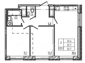 •	Две изолированные комнаты: 11,1 м² и 11,3 м²