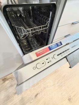 Кухня с обеденной зоной и всей бытовой техникой (индукционная плита, холодильник, посудомоечная машина, СВЧ, чайник, посуда).