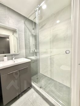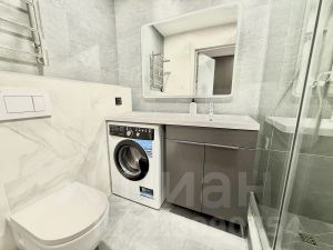 Ванная комната с душевой кабиной, стиральной машиной, полотенцесушителем и зеркалом с подсветкой.