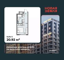 Продается 1-комн. квартира-студия от застройщика с предчистовой отделкой в ЖК "Новая Земля" на 17 этаже. Общая площадь: 20.92 кв.м., площадь гостиной 15.07 кв.м., из которых 5.33 кв.м. выделено под кухонную зону. Все окна выходят на одну сторону. В квартире один совмещенный санузел. Высота потолков 2.85 м.