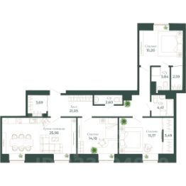 Евроформат — три спальни и кухня-гостиная, большие окна, высокие потолки, современное инженерное оснащение.
