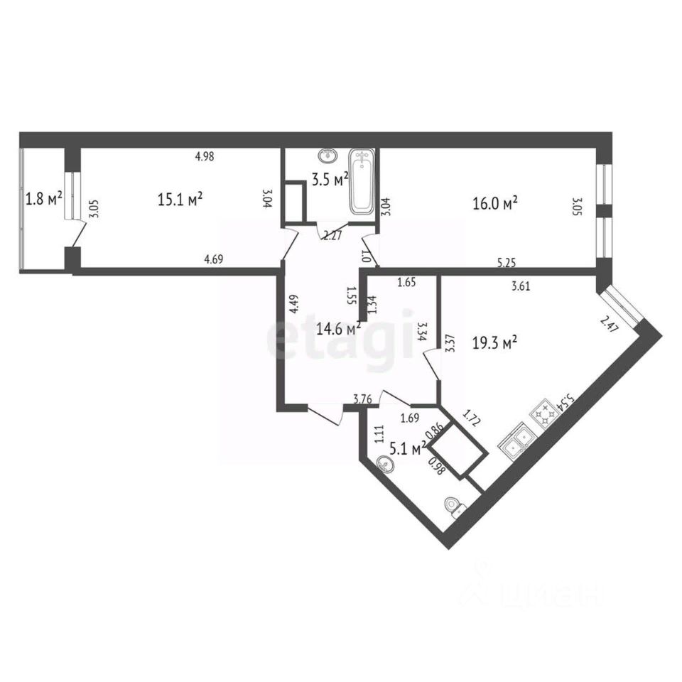 Общая площадь квартиры 73.9 м. Кухня гостиная 19.3 м с большим кухонным гарнитуром. Две спальни 16 и 15.1 м, раздельный санузел 5.1 м ( есть возможность установить душевую кабину при желании) и 3.5м , прихожая 14.9 м с большим количеством мест для хранения ( помимо шкафов есть глубокая гардеробная ), балкон 1.8м.